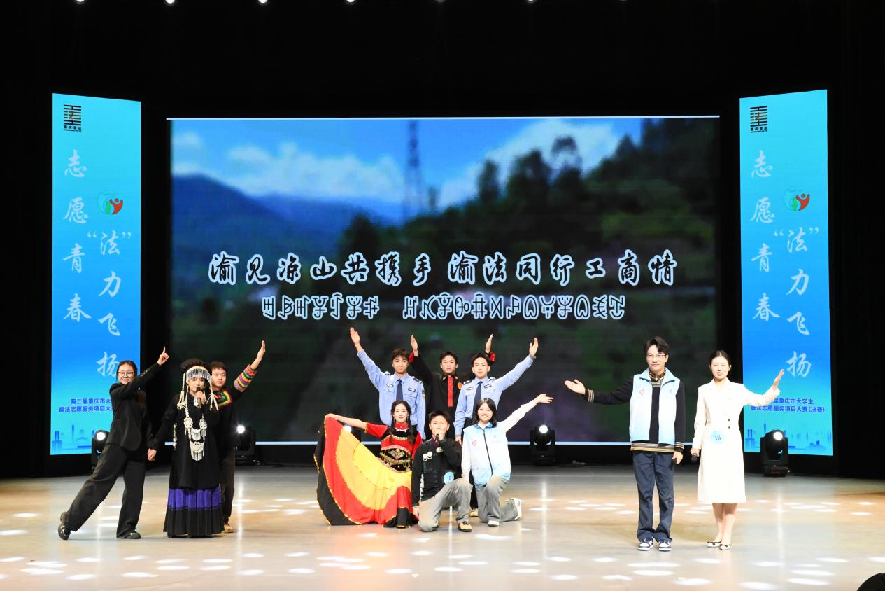 决赛现场,由法学与社会学学院分团委书记何祖润带队,20余名普法团队学生成员通力合作、密切配合,采取PPT汇报、情景剧、普法歌舞表演等形式进行项目展示,将法律知识转化为群众听得懂、用得上的“法治大餐”。最终,“渝法惠企”项目与“渝见凉山”项目分别以全市第6名、第7名的优异成绩斩获银奖2项。