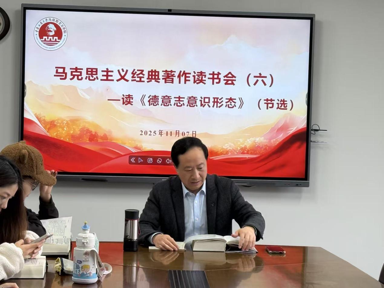 11月7日下午,马克思主义学院第六次经典著作读书会在慧智楼1210会议室开展。本次活动以《德意志意识形态(节选)》(第一章 费尔巴哈)为核心研读文本,由马克思主义学院教授邓龙奎主讲,马克思主义基本原理研究方向一、二年级研究生全员参与。读书会旨在深化青年学子对马克思主义经典著作的系统性理解,强化对马克思主义基本原理的精准把握,搭建高质量师生学术交流平台,引导青年在经典研读中坚定信仰、锤炼本领、勇担时代使命。