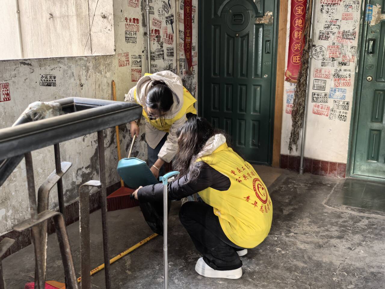 活动伊始,志愿者们在学校门口集合,清点人员与物资后有序前往活动地点。抵达红旗开关厂后,大家迅速熟悉场地,明确各组成员以及清洁区域,有条不紊地领取扫帚、簸箕等清洁工具,随后前往清扫地点。活动中期,志愿者们分组开展清洁工作。楼道组清扫楼栋角落的落叶杂物,让楼道恢复整洁;保洁组擦拭扶梯上的灰尘,使其清洁干净;环境组清理街道及绿化带边缘的垃圾,为社区添上一抹亮色。在劳动过程中,志愿者们与厂区老人们进行了深入的交流,为他们的独居生活增添了几分乐趣,现场气氛温馨,暖意融融,宣传部人员及时用镜头记录下一个个暖心的画面与志愿者们的劳动瞬间。