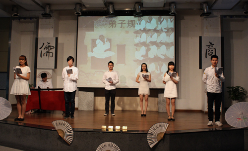 团日活动以传承儒家文化为核心,分“幼时启蒙”、“少年求学”、“经商之路”、“问道儒商”四个篇章进行。气势恢弘的师生齐诵《弟子规》,嗓音清脆交错的古筝演奏《在水一方》,刚劲有力的武术表演,令人回味无穷;话剧《范蠡经商》带领大家重回春秋年代,再现“经商之路”的坎坷;接踵而来的《惊鸿舞》凭姿态柔美,令人沉醉在传统文化的无穷魅力中。最终,团日活动在观众们与会师生庄严的团歌声中落下帷幕。