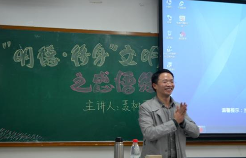 以讲座的形式感悟经典,讲座邀请到管理学院教师聂树平,他用幽默的言语营造了一个轻松的经典文化学习氛围,通过实例表现出文明礼貌在生活学习中的重要性。从《弟子规》的“前世今生”、内容、学习方法和当前价值几个方面全面的对这本国学经典进行了全面解读,讲解到《弟子规》内容时更是结合同学们学习生活中出现的一些问题实例对听众同学进行启发,使同学们对中华传统文化和文明修身的理解更加深刻。