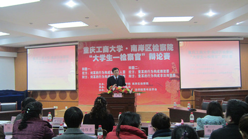 12月4日晚,由法学院分团委主办的首届“大学生——检察官”辩论赛在慧智楼90426模拟法庭顺利举行。南岸区检察院副检察长黎先文、邹望,政治处主任李朝东、职务犯罪侦查局局长司智虎,学校党委宣传部副部长杨维东、学生处副处长李丽莎、校团委副书记杨娟、法学院党总支书记李自维、法学院院长杨和义等应邀出席。