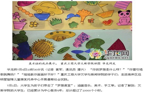 7月1日至7月5日,我校文学与新闻学院以“中国梦”为契机组建2013年暑期“三下乡”社会实践团,在学院团委书记肖婷老师的带领下前往南坪东路社区、南岸区启明星智障儿童康复托养中心开展以“传递青春正能量,共建美丽中国梦”为主题的暑期“三下乡”社会实践系列活动。活动以丰富的内容、多样的方式得到社区居民、智障儿童学校师生以及社会媒体的广泛关注和一致好评和。