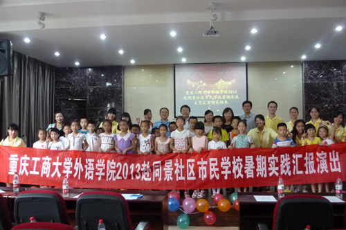 7月5日下午2点,我校外语学院2013年暑期“三下乡”实践团在同景社区报告厅成功举办“贡献青春正能量·共筑美丽中国梦”主题文艺汇演。南岸区长生桥镇党委组织委员李敏、同景社区党委书记文李燕、同景社区居委会主任李小渝,我校团委副书记吴佑波、外语学院党总支书记申卫东、学院分团委书记冉永琴等应邀出席观看了汇演。