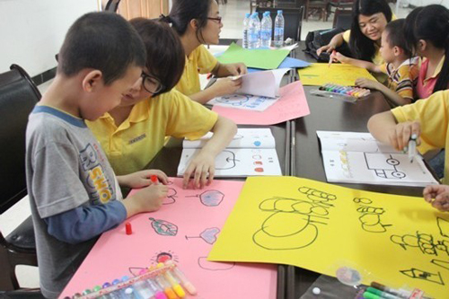 在辅导完孩子们热身活动后,5名智障儿童在老师的带领下走进了美术班,看着色彩鲜亮的卡纸和水彩笔,小朋友们拿起了笔,还没等我们开始,便开始在纸上画画。