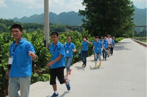沿途弥漫着农耕的气息。我们路过村民的养蚕房,旁边田里的桑树枝繁叶茂;我们踏过村民的鱼塘,塘里的鱼儿活蹦乱跳。这让全体队员深深感受到国家政策对农民强大的扶持力度,农民的生活在越来越好。队员们顶着烈日高温迈进,沿途的一片片玉米地形成的波浪美景让队员们减少了几分疲惫。历时两个多小时,走过近五公里山路,全体队员终于到达陈爷爷家。进门看见陈爷爷正在灶头生火煮猪食,队员们也顾不上夹杂的汗水与泪水,扔下背包,开始劳动,有的去扫地,有的去摘菜,有的去喂猪。转眼已到傍晚时分,在陈爷爷的邀请下,大家一起生火做饭,其乐融融。吃完饭收拾完毕之后,“阳光逐梦者”社会实践团队的队员和陈爷爷老两口合影留恋,为我们的“同吃、同住、同劳动”实践活动画上了一个圆满句号。