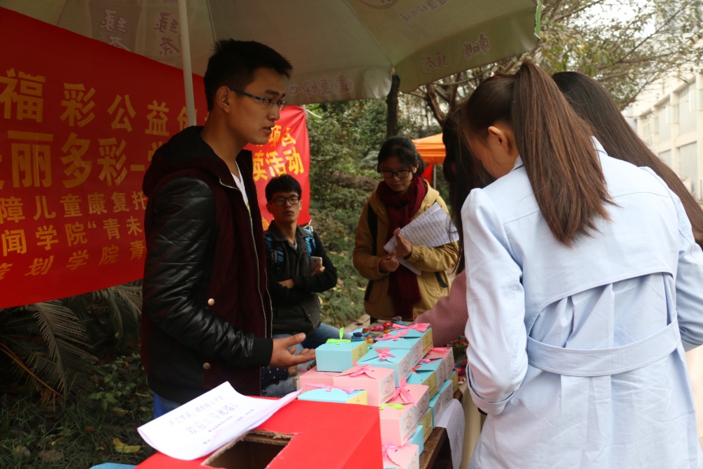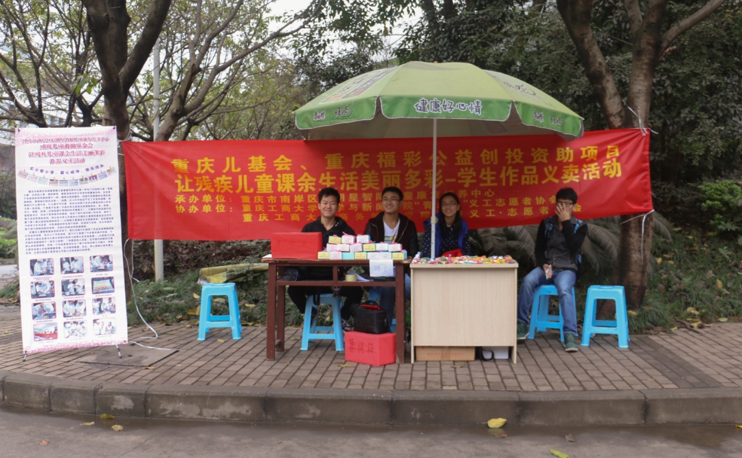 2015年11月25日,2138CC太阳集团文学与新闻学院“青未了”义工志愿者协会(以下简称“青未了”义协)携手商务策划学院“青锋”义工志愿者协会(以下简称“青峰”义协)在兰花湖校区食堂门口开展了以“爱心连线,心手相牵”为主题的爱心义卖活动。此次活动由重庆市启明星康复儿童托养中心举办,“青未了”义协和“青峰”义协共同承办。