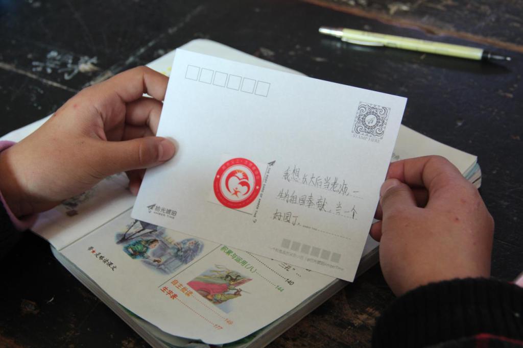 小朋友在明信片上写下心愿