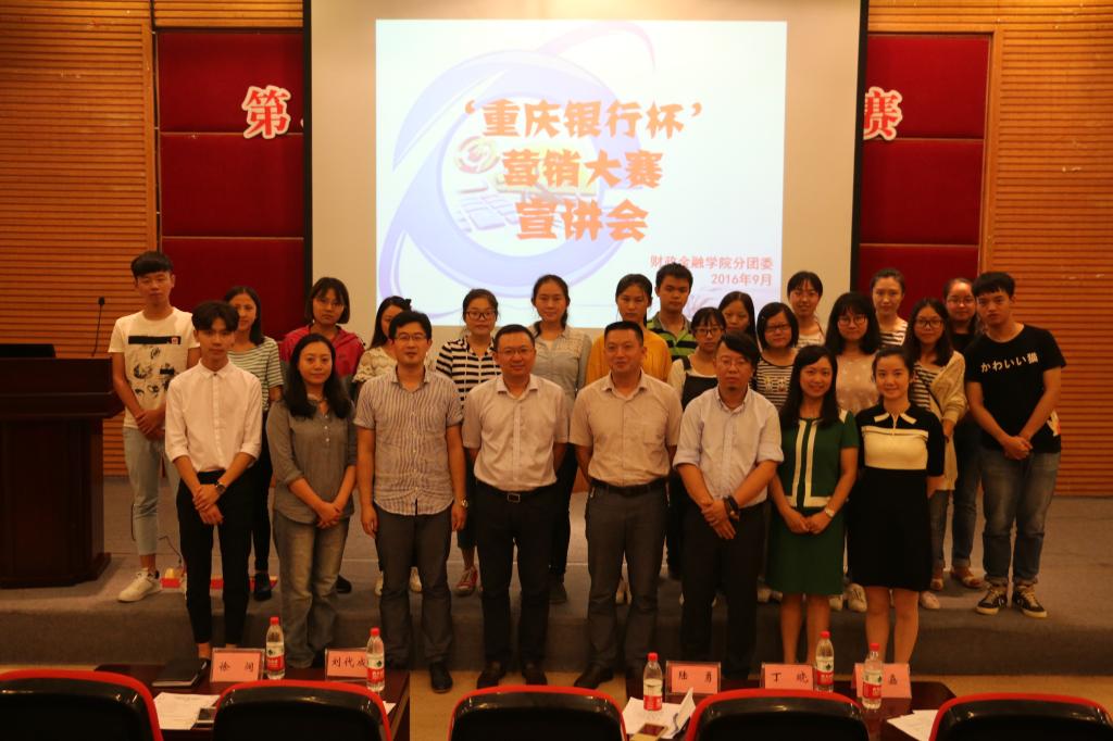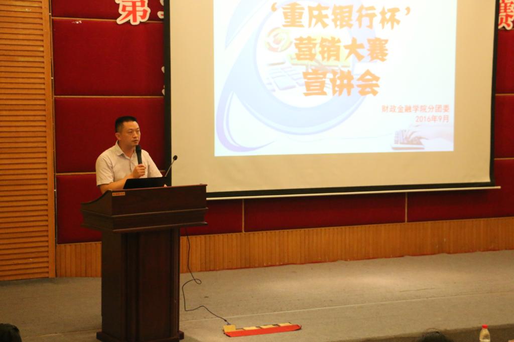 为提升财金学子的综合能力,弘扬财金文化,彰显财金特色,2016年9月23日下午2点,财政金融学院第六届“大学生金融节”之“重庆银行杯”营销大赛宣讲会在7200报告厅拉开帷幕。重庆银行个人银行部总经理陆勇、企业文化与公共关系部总经理助理丁晓、个人银行部产品开发及营销中心经理兼九龙坡广场支行行长助理叶嘉、财金学院党总支副书记刘代成、分团委书记徐阔出席本次宣讲会。