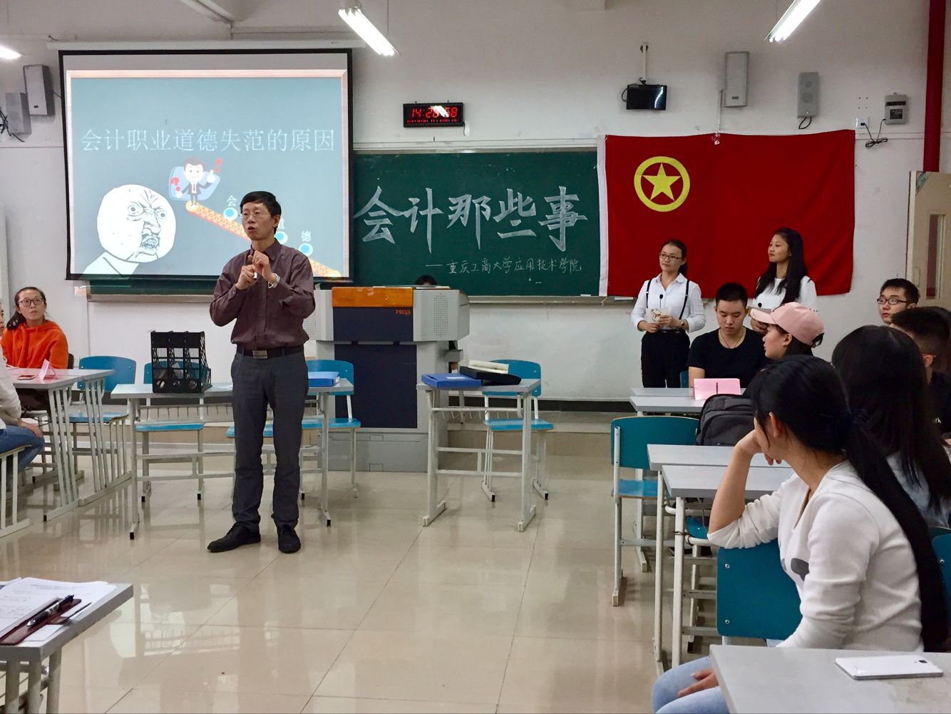 活动伊始,情景剧“小会计的从业辛酸史”生动的反映了当代许多小会计的进退维谷,并引出了“上道”还是“有德”的话题;通过财务造假的案列呈现了会计道德万象。同学们踊跃发言,从社会、公司、专业、个人四个方面分析了会计职业道德失范的原因。谢泽文老师就会计职业道德失范的原因进行了总结,告诫同学们“学会计要从不做假账开始,对国家的政策要进行准确的把握,对于职业道德要铭记于心、付之以行”。冯院长就如何重塑会计职业道德与同学们进行了互动,对未来的会计们提出了“坚守职业底线,在会计行业中树正风”的期望。此次活动在未来小会计的宣誓中圆满落幕。