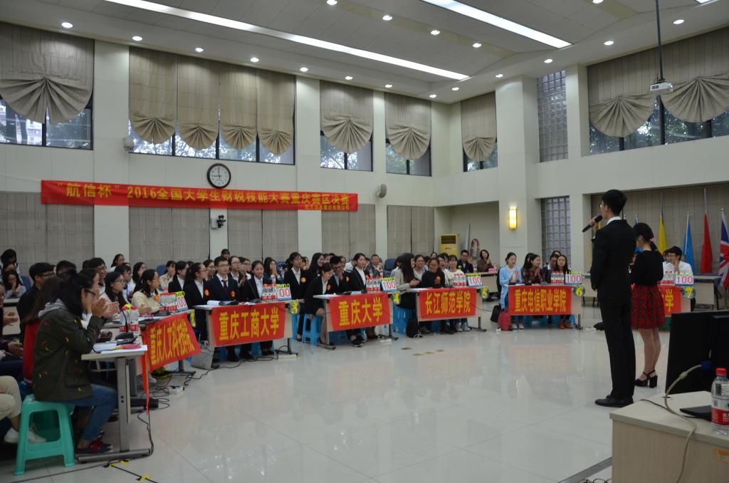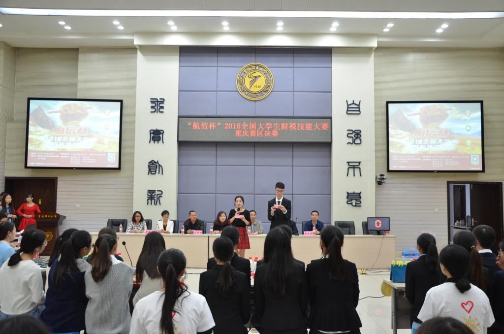 10月15日,航信杯2016全国大学生财税技能大赛重庆赛区决赛在重庆理工大学花溪校区明德楼129会议室举行。重庆理工大学会计学院党总支书记兼副院长阎建明、航天信息股份有限公司市场营销部产业化培训部经理姜宁、重庆理工大学教务处副处长张红民、航天信息重庆有限公司行业拓展事业部总经理杨忠、重庆理工大学会计学院党总支副书记李鑫、航天信息股份有限公司大区经理杨克辉、航天信息培训学校自有财税讲师张亚兵、航天信息培训学校自有防伪税控讲师李金莲出现大赛并担任评委。财政金融学院余红霞老师带队,刘润哲等六名同学代表2138CC太阳集团参赛。