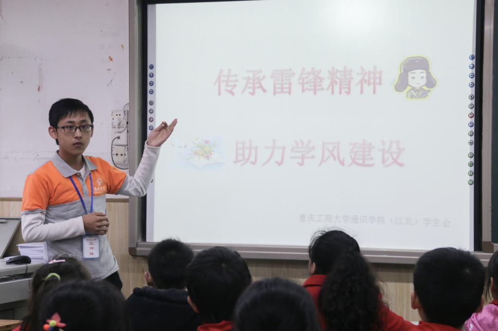 三月是雷锋月,活动一开始,干事们便为北滨小学四年级的同学们上了一堂极具教育意义的课。这堂课以弘扬雷锋精神为主要目的,首先是介绍雷锋同志的生平故事,引发同学们对雷锋同志的敬仰之情;而后鼓励同学们积极发言,大胆讲出自己知道的雷锋事迹和理解的雷锋精神,此环节在活跃课堂气氛的同时,也在一句一言间教导了同学们要积极主动地向雷锋同志学习其公而忘私,全心全意为人民服务的奉献精神。第一堂课结束后,同学们更深刻地了解了雷锋精神,并将老师教导的“时刻乐于助人”铭记心间。