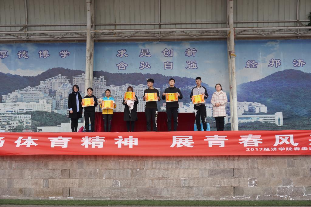 本季运动会设置了男子100米、200米、女子仰卧起坐、60米迎面接力跑等17个项目。跑道上运动员们健步如飞,跳长绳项目中队员们默契配合。每一位运动员都尽情挥洒青春和激情,为了自己班级的荣誉努力拼搏,此起彼伏的加油声,让现场观众和运动员们在瑟瑟冷风中也感觉热血沸腾。所有运动健儿充分展现了“友谊第一、比赛第二”的体育精神,在和谐友好的氛围中相互竞技。运动会最后举行了颁奖典礼,同学们群情激昂,不断为获奖运动员们鼓掌、喝彩,最终15贸经三班、15贸经二班、15会展班分别取得班级总分排名一、二、三名,获得学院为其精心准备的丰厚奖品。