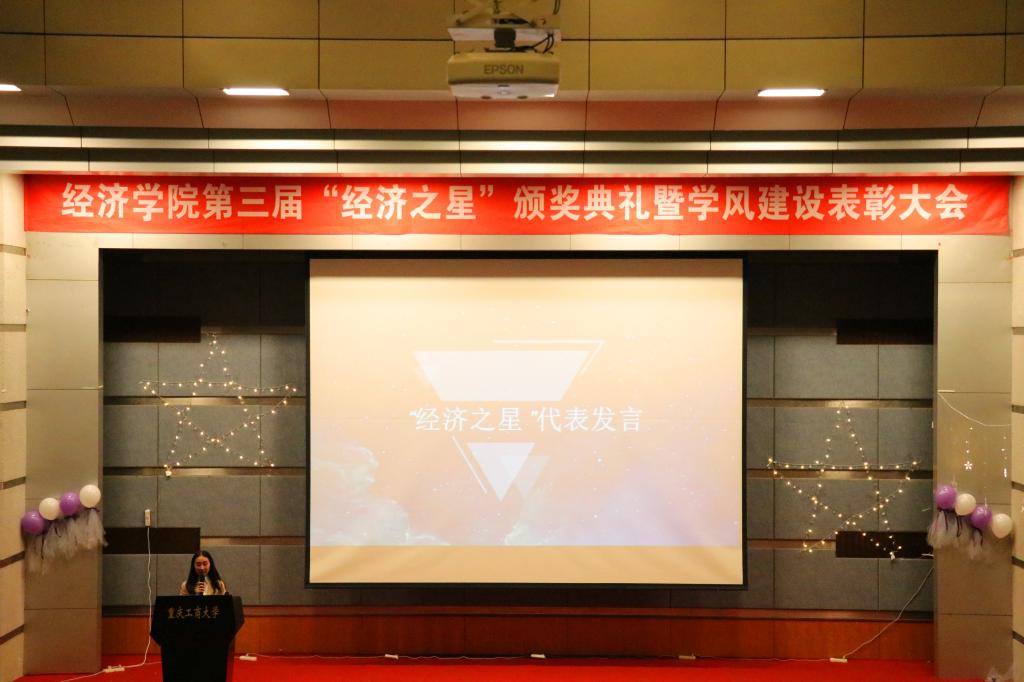 为表彰各方面表现优异的同学,鼓励学生全面发展,经济学院已连续举办了两届“经济之星”评选活动。历经数月的层层筛选,最终选出第三届的六位“经济之星”:“学习之星”——张蕊、“科技之星”——郝泽坤、“体育之星”——邬丽虹、“文艺之星”——肖程钱、“实践之星”——肖丽灵及“公益之星”——杨许超。大会现场首先播放了经济之星们的风采展示视频,他们的事迹使在座的同学们深受鼓舞。“文艺之星”肖程钱同学代表“经济之星”发言,并以自己的经验与感想鼓励同学们用知识充实头脑,用成就装点人生。
