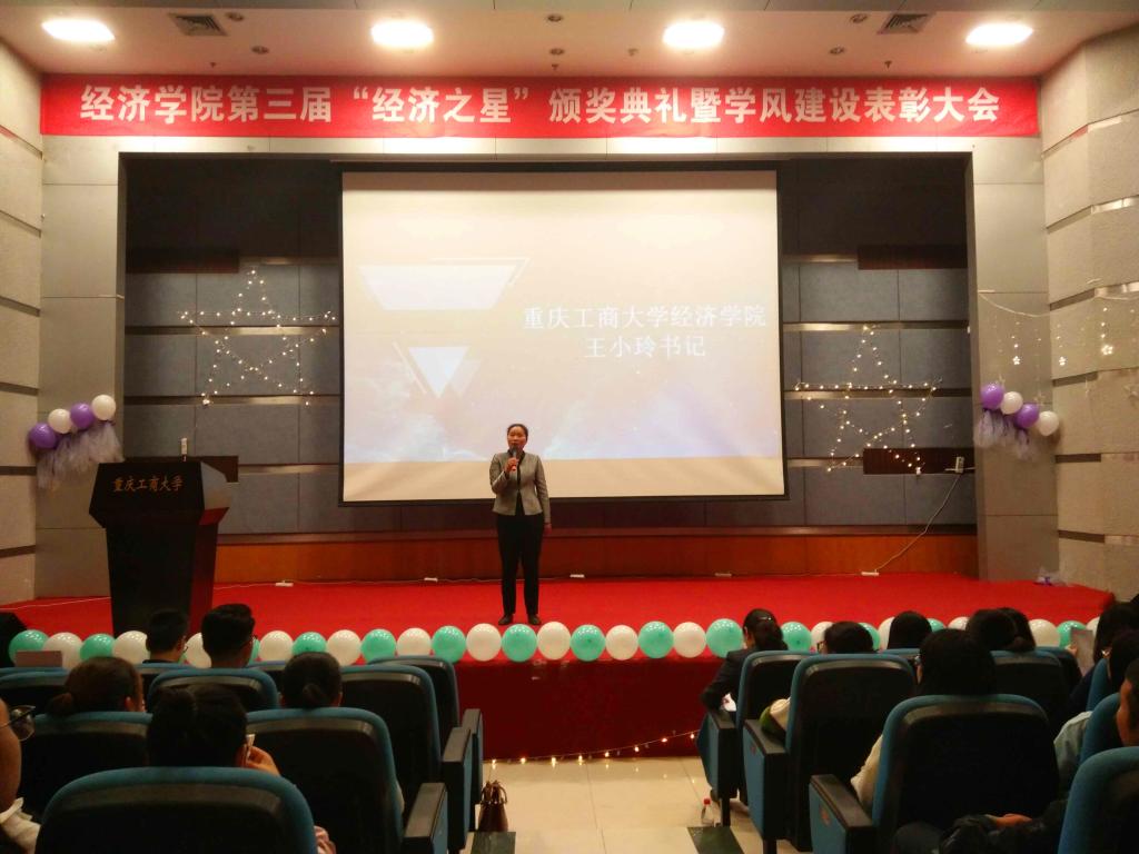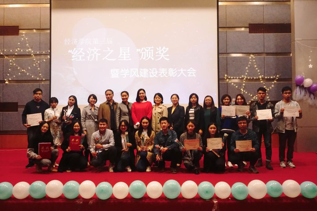 10月13日,经济学院第三届“经济之星”颁奖典礼暨学风建设表彰大会于博智楼7100报告厅举行。经济学院分党委王小玲书记、于频副书记,学院宋瑛副院长,国贸系主任蒋兴红老师,贸经系主任杨海丽老师,杨军副教授,教务办主任严艳老师以及学院全体辅导老师们出席了此次活动。大会分为“经济之星”颁奖、学风建设表彰颁奖和2017年经济学院暑假社会实践汇报及“我的青春我的梦”主题征文 颁奖三个环节。