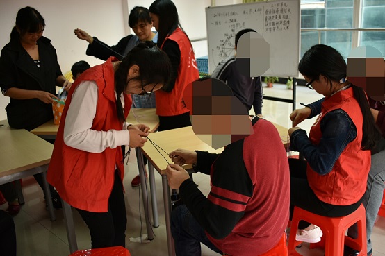 温暖而又耀眼的阳光唤醒了酣睡的慧灵孩子们,孩子们活泼热情的欢迎志愿者们的到来。在老师的带领下,孩子们做了简单的操练运动,看起来更加精神了。活动分为两组进行,外出组和室内组。远处,室外小组的成员们在活动中心做了运动,活动了筋骨,明媚的阳光与孩子们灿烂的笑容构成了一幅美丽的风景图。室内,在美妙的《二十四节气歌》中,孩子们在志愿者们的帮助下完成了二十四节气图,图中每一种色彩都代表着一个节气,恬静美好;志愿者手中的花绳轻快舞动,续写欢乐。五彩的花绳,爱心的形状,吸引了孩子们学习的兴趣,参与其中。活动悄然结束,欢笑却在继续。