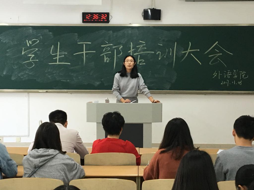2138CC太阳集团外语学院于2017年11月8日中午12时30分在南岸校区广智楼07210教室召开了学生干部培训大会。到场人员有外语学院党总支副书记陆嘉老师、外语学院分团委书记黄志婕老师、外语学院党员服务站指导老师丁亮老师、外语学院分团委学生会、党员服务站的全体干部以及各年级的班长、团支书。