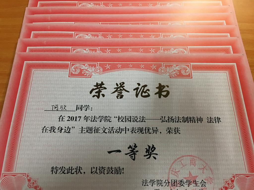 在法学院分团委组织的专家精心甄选下,本着公平公正、择优选优的原则,在参赛同学的作品中评选出了一等奖1名,二等奖2名,三等奖5名。在激烈的选拔中,何欣同学脱颖而出,荣获一等奖,黄艳娜、李美林两位同学荣获二等奖,熊航、陈佳依、夏利、王维、徐定羊五位同学获得三等奖。同学们表示此次征文比赛让他们深入社会生活,以全新的视角思考法律问题,他们也在创作的过程中受益匪浅。