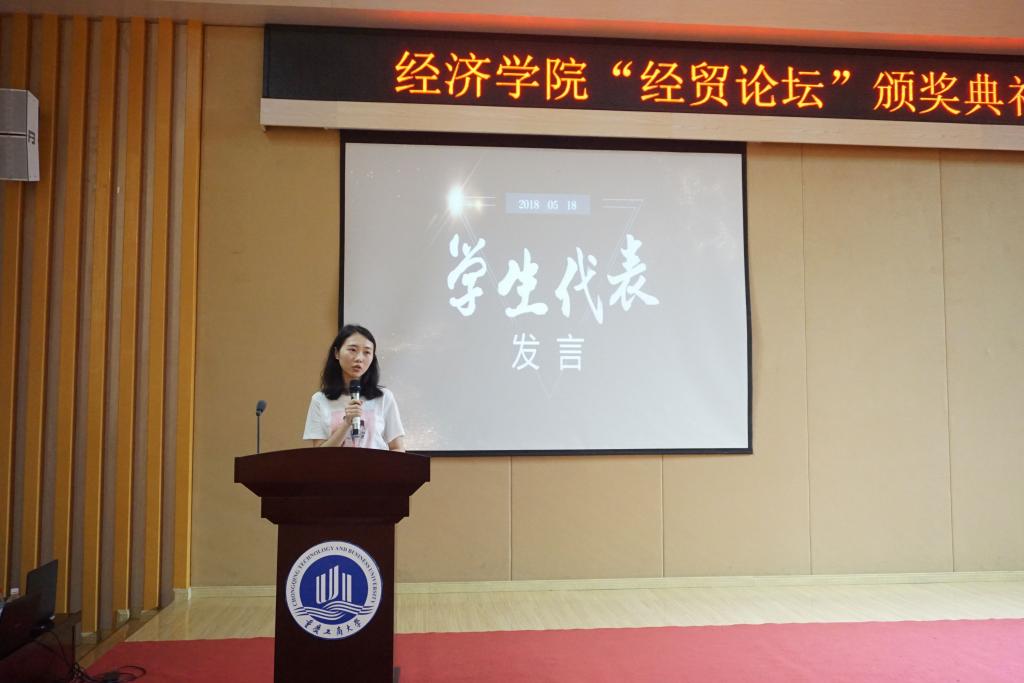 本次大会在庄严的校歌合唱声中开始。活动共分为四个环节,包括第十一届“经贸论坛”颁奖;风建设工作表彰;活力团支部;优秀国防班会以及36182素质拓展颁奖和国贸技能大赛发布会展示。首先,王小玲书记为本次颁奖典礼致辞,希望同学们可以将理论和实践相结合,不断的加强学术能力的培养。随后,由院长助理黄潇老师宣读了本届“经贸论坛”的获奖名单。学生代表任培艺同学分享自己的获奖经验,表示在学术论文选题、撰写等方面,要多和老师、同学加强沟通交流,不断的完善文章思路,同时感谢学院有这样一个平台,可以让同学们的论文写作水平得到锻炼。