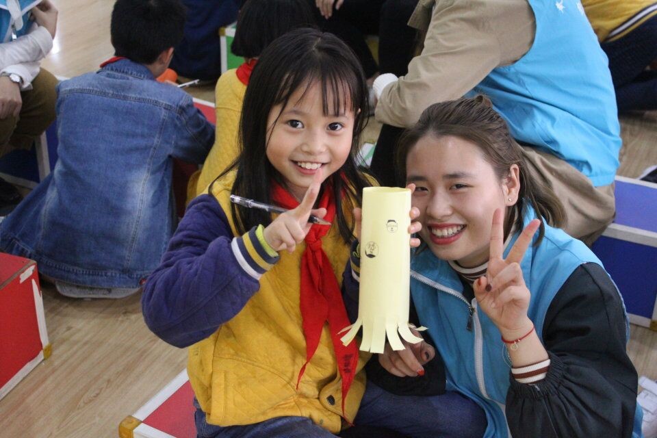 志愿者与孩子们用废纸折笔筒