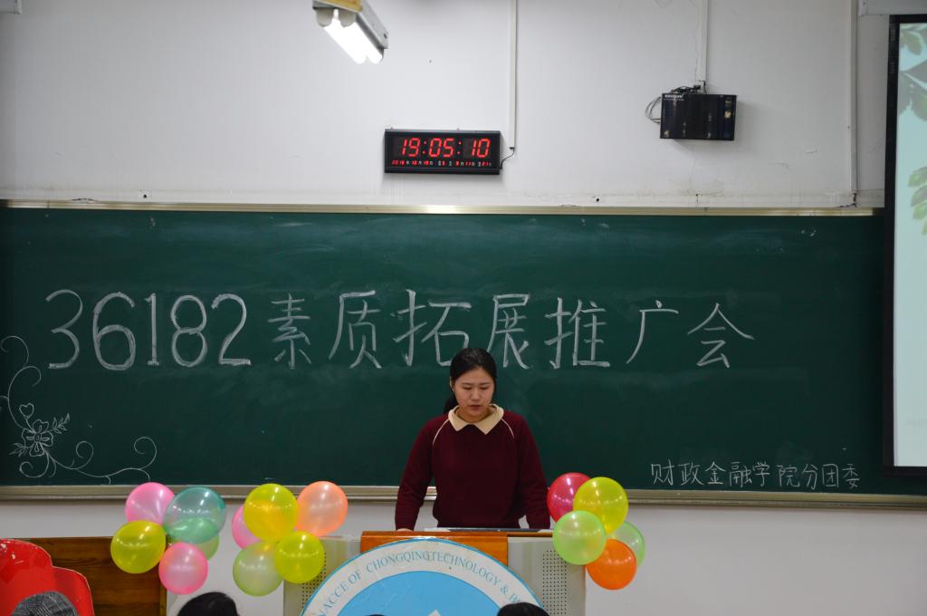 2018年10月19日19:00点,由财政金融学院分团委主办的第八届青马文化月之“36182”素质拓展推广会活动在博智楼07106教室顺利开展。本次素拓推广会对18级CFA新生及17级同学的素质拓展计划提出合理化建议,引导和激励学生更好地进行素质拓展。