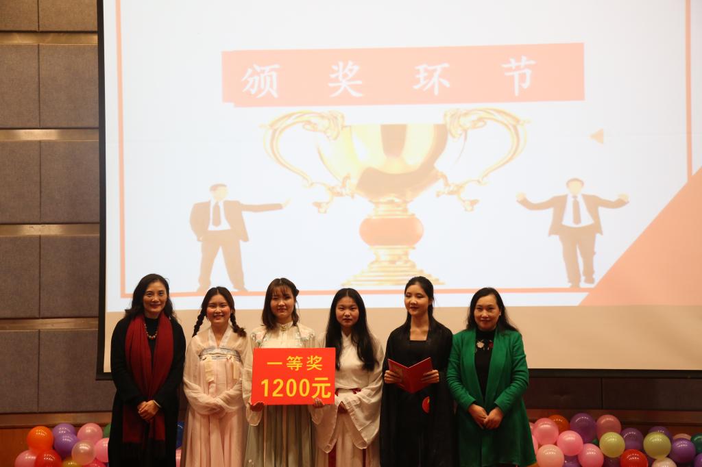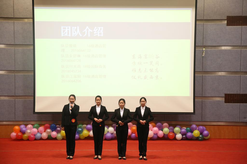 比赛开场校艺术团民乐分团给我们带来了精彩绝伦的琵琶古筝合奏《知否》,让我们见识到了古乐之美。随后主持人一一介绍了莅临此次比赛的嘉宾和评委,全体同学以热烈的掌声欢迎他们的到来。掌声过后主持人向我们阐述了商务礼仪比赛的宗旨,让大家对商务礼仪有了更深入的了解。接着主持人播放了经过激烈的竞争进入决赛的八支队伍精彩的VCR。VCR结束后主持人向大家讲解了比赛流程和评分标准,并宣布比赛正式开始。比赛第一环节进行了团队风采展示和自我介绍,随后第二环节进行了紧张又十分考验选手的知识问答,参赛选手丰富的知识储备以及对商务礼仪的熟知让大家赞叹连连。接着第三环节进行了礼仪情景模拟,选手们娴熟地在商务往来中运用商务礼仪,散发礼仪之美。之后,主持人进行电话互动抽奖环节,将全场气氛推向高潮。互动结束后,每个团队进行才艺表演,给大家带来了不同的视觉盛宴,给观众留下深刻的印象。在杨炎老师精彩的点评后,主持人公布了比赛结果。随后获奖队伍上台领奖合影。掌声过后,主持人宣布此次商务礼仪决赛完美落幕。