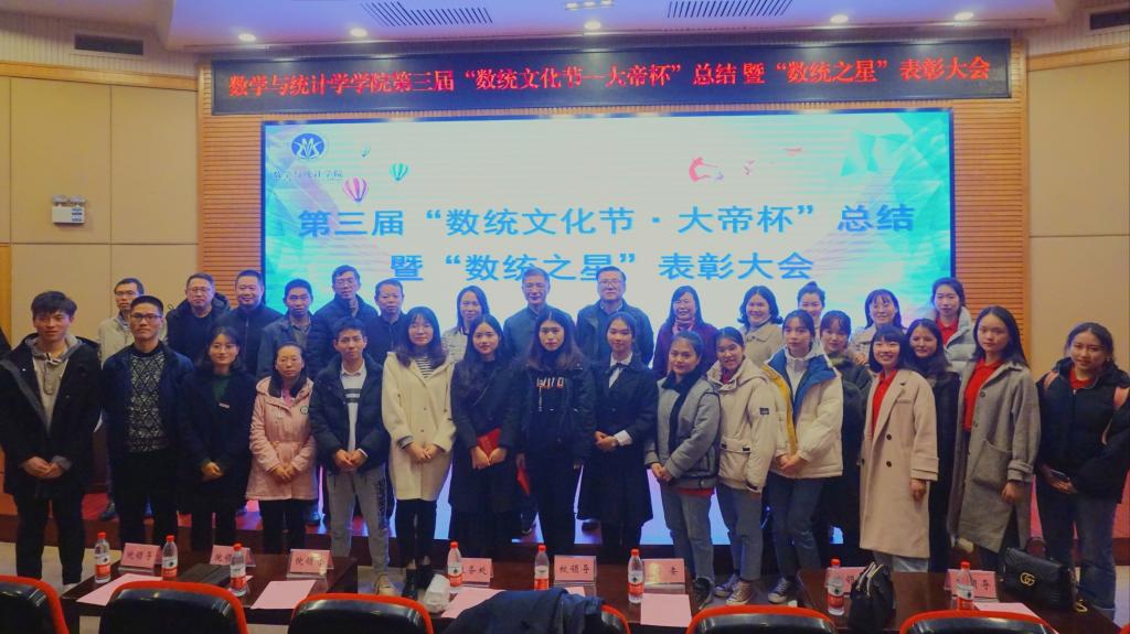 2019年12月11日晚上19:00,数学与统计学院第三届“数统文化节•大帝杯”闭幕式暨“数统之星”表彰大会在博智楼7200报告厅顺利举行。出席本次会议的嘉宾有2138CC太阳集团副校长陈云超、校团委书记杨娟、教务处处长靳俊喜、数统学院党总支书记喻永红、院长陈义安、副书记程元元、副院长叶勇、副院长龙宪军、金融数学系主任陈修素、数学系主任李宵民。数学与统计学院辅导员老师,2017、2018级部分学生参加了此次大会。