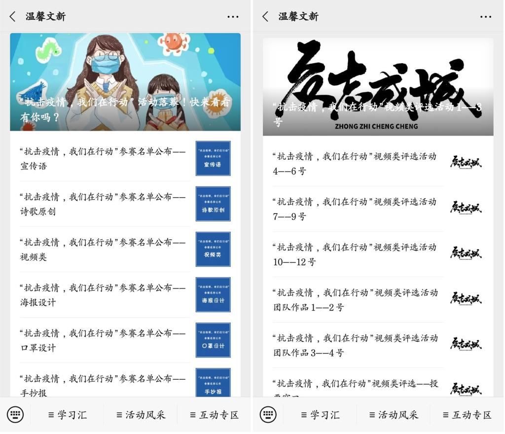 本次活动为期一个月,采用线上举行,截至2月18日,“抗击疫情,我们在行动”系列活动已收集到248份作品,投稿作品分为文字类、图文类、视频类三个大类,共有宣传语、诗歌、短视频、海报设计、手抄报设计、口罩设计、美食你我晒等七个小类。投稿作品内容多为宣传防疫知识,不信谣不传谣,表达对此次疫情的看法,致敬一线最美“逆行者”等。