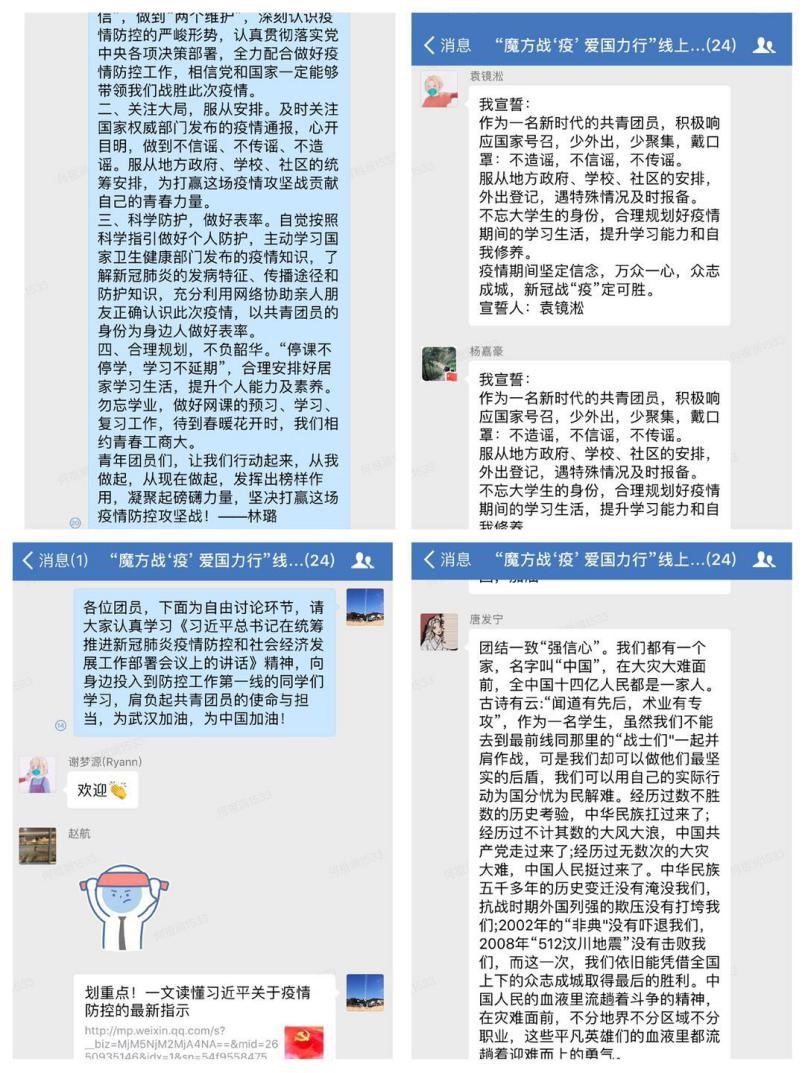 为深入贯彻学习《习近平总书记在统筹推进新冠肺炎疫情防控和社会经济发展工作部署会议上的讲话》精神,发挥基层团组织的后备军作用,M魔方社团支部的团员们于3月7日在网上团支部“云报到”,利用企业微信平台举行了以“共抗疫情 爱国力行”为主题的线上团日活动。法学院党总支书记李自维、副书记林璐、分团委副书记何祖润也来到线上与21名团员一起“云相聚”。