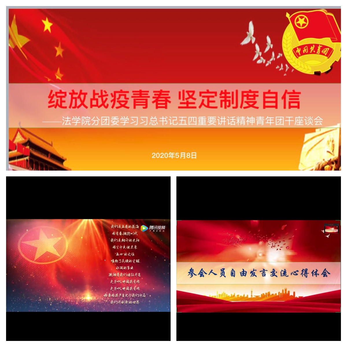 为深学笃用习近平新时代中国特色社会主义思想,深入学习党的十九大精神和习总书记系列讲话精神,进一步弘扬五四精神,凝聚我院青年团干众志成城抗击疫情的青春力量,展现有担当、甘奉献的法学青年风貌,5月8日下午14:00,法学院分团委举办了“绽放战疫青春,坚定制度自信”学习习总书记五四重要讲话精神青年团干线上座谈会,二十余名青年团干齐聚云端,学习先进思想,畅谈学习感悟。