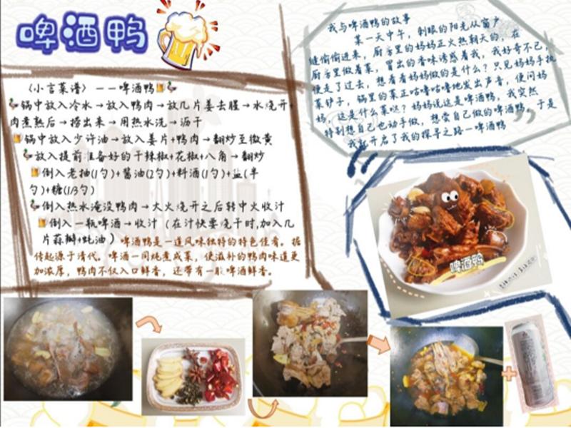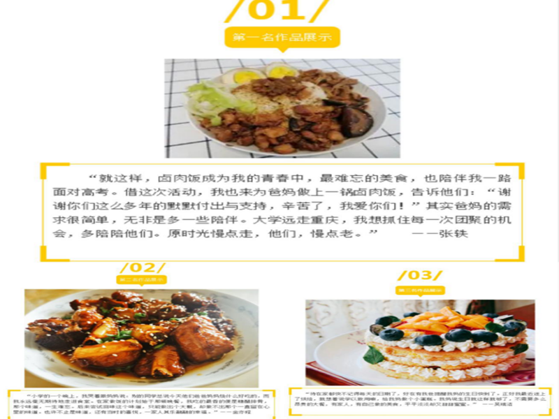 本次活动的参赛形式有图文海报和短视频加故事文本两种形式。同学们积极参与,将自己的情感融入食材,烹饪出具有特殊意义的美味菜肴,在战“疫”的同时尽一份别样的孝心。选手们的作品内容都生动重情,每个作品背后都有一个独特的小故事:有为母亲亲手制作的生日蛋糕,有为家人独创的槐花蛋饼,有祝福家人的三生三世无忧糕,每一份美食都承载了无限情谊,每一份情谊都值得珍惜回味。