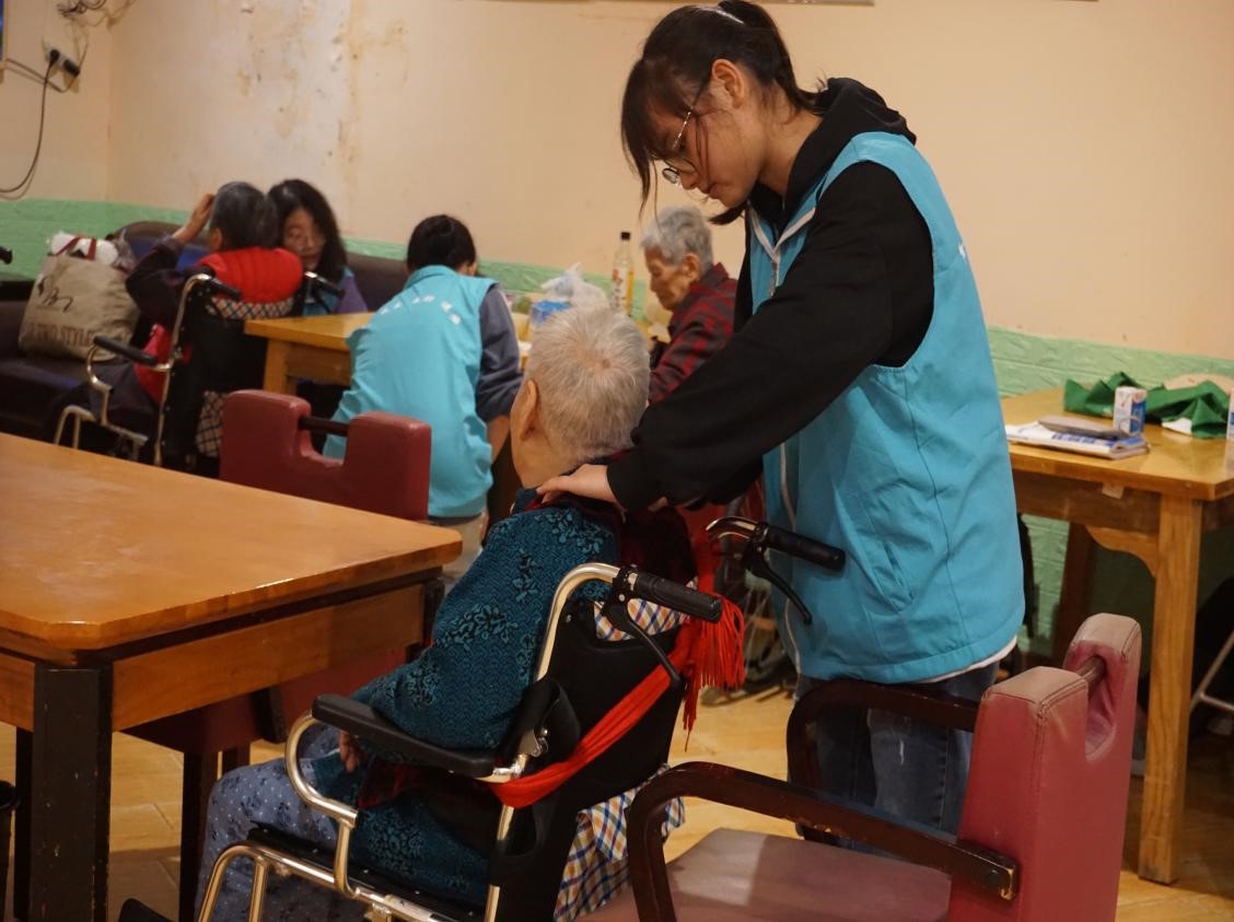 慰问过程中,志愿者们跟随养老院工作人员的步伐,了解各个老人的生活习性,将提前准备好的水果、糕点、牛奶等慰问品分发给了老人手中。老人得知是大学生志愿者前来探望他们,紧紧握住了同学们的手,嘴里念叨着“社会没有忘记我们,青年都年轻有为啊!”看到老人们笑容洋溢的脸庞,志愿者们也不禁紧紧地回握住了老人们那瘦弱而有力量的手。随后,志愿者们陪伴在老人们的身旁,耐心地和老人们聊天,小心地搀扶着老人和他们在走廊散步,认真地为无法活动的老人们按摩肩颈……窗外是阴雨绵绵,而养老院内,志愿者和老人们欢聚一堂,其乐融融。