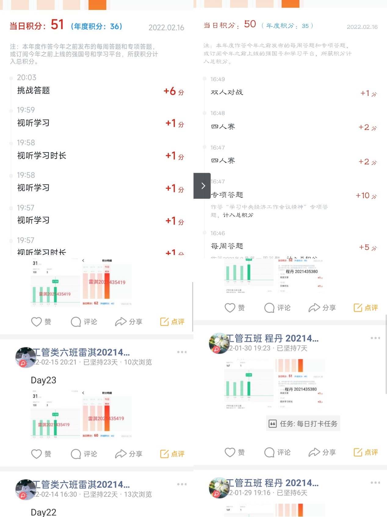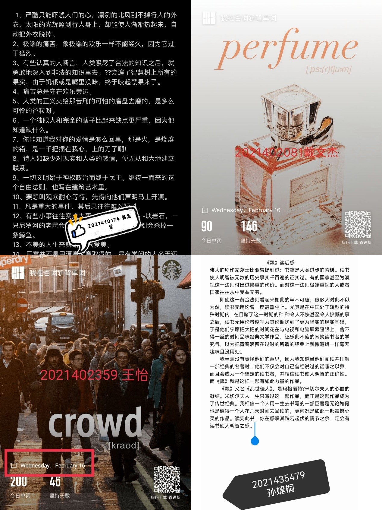 本次活动以线上形式开展,历时24天。秉持“学习互助”与“学习监督”的理念,同学们在QQ打卡小程序上分享自己的假期生活,通过打卡的形式达到“督学”的效果。同学们借助“学习强国APP”学习党的第十九届六中全会精神;借助“健身Keep APP”加强锻炼、增强体魄;借助“百词斩APP”和“每日阅读”拓展知识面。在活动中,“学习强国”中的答题积分彰显着工商学子坚定的理想信念,激励青年们勇于拼搏进取;户外运动的跑步轨迹延伸出同学们昂扬的姿态,铭刻下日复一日的自律与恒心;备忘录中书写下的读书笔记洋溢出浓浓的书香,融入同学们深入的思考和独到的见解;背单词与阅读外文的记录无不展现出工商学子积极向上的精神风貌。同学们热情高涨,本次活动参与人数达到368人,最终186人获奖,其中40人坚持打卡21天,79人坚持打卡15天,67人坚持打卡8天。