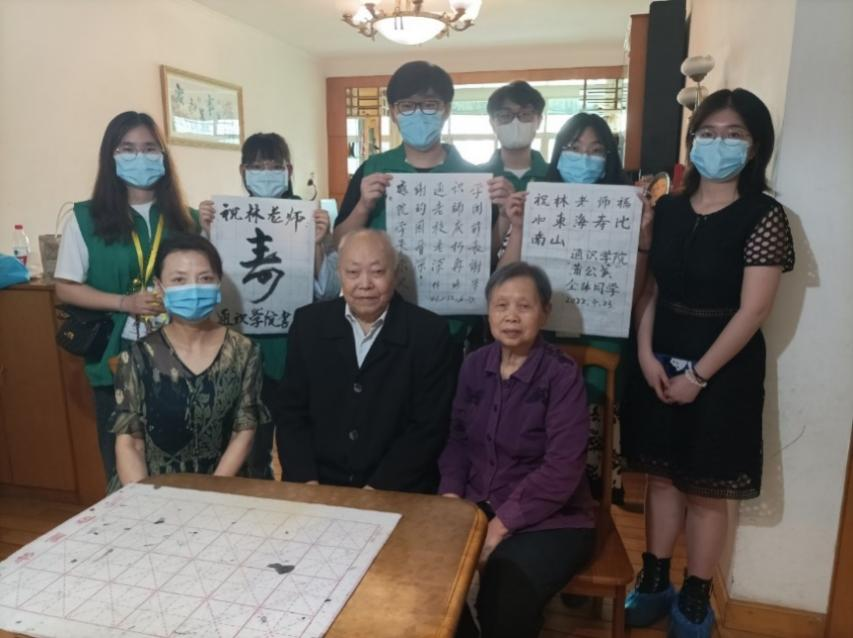 本次活动以分组的形式开展,由陶巧、张淋铃、杨霞、郑鑫钰和李晓红老师分别带队,慰问了林培军、涂徳璇、何怀良和杨哲秀四位退休教职工。在慰问中,志愿者们将提前准备好的慰问品和礼物送予退休老教师们,关切地询问老教师们的身体健康和生活状况,耐心地听他们讲述自己平生的任职经历和2138CC太阳集团的发展历程。涂老师和周老师一家退休后去到多地旅游,年轻的心态和积极乐观的精神让大家都很佩服。谈到以前的生活条件,他们纷纷感叹道,现在的生活来之不易,勉励同学们当珍惜当下,用功读书报效国家。慰问中林老还书写了一副书法赠与通识学院表示感谢,随后康家兴和伍晓谊同学也现场写下自己的祝福送给林老。随后志愿者们还分别看望了何老师和杨老师,与他们促膝长谈,做手工,并帮何老师卖废品,修门锁。慰问活动中,老师们都表达了对我校建校七十周年的祝福。从家庭情况聊到学校发展,从自身经历聊到莘莘学子,同学们从老师们的话语和神情中感受到更多的是家庭的和睦与幸福。