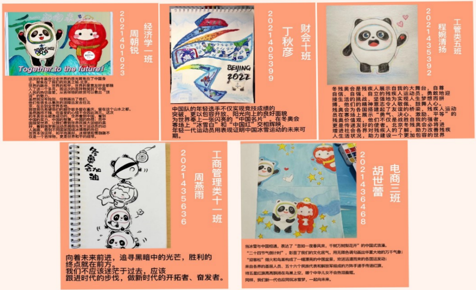 活动一经发起,便得到了老师和同学的热烈回应。北京冬奥会举办前,我院“蒲公英”青服举办“相约冰雪,燃情冬奥”宣讲活动,通过冬奥宣讲和知识竞答获得冬奥纪念币的形式,已让同学们对冬奥有了初步的了解,而此次活动更让冬奥走进了同学们的心中。除了“网红”冰墩墩、雪容融,同学们还积极主动地解到了更多冬奥背后的故事,南方的同学更多地感受到了冰雪运动的魅力,拓宽了视野,得到了知识的补充。更多的同学深入了解后被奥林匹克精神所感动,决定付诸实践,用奥林匹克精神中的勇气和决心去克服生活与学习上的困难,以乐观向上的奋发精神去迎接每一天。不仅如此,冬奥的开幕式也带给了大家极大的震撼,中华优秀传统文化走出国门、走向世界,让同学们的民族自豪感和认同感油然而生,更加坚定大家努力成才、报效祖国的信念!
