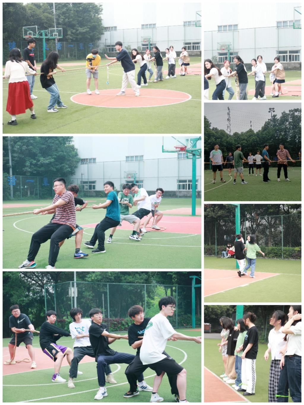 户外拓展环节,同学们来到篮球场开展拔河比赛和绑腿跑活动,两两一组搭着面颊,拦着腰,携手前行,“1、2!1、2”呐喊迈出整齐的步伐,整个场面既紧张激烈又充满欢乐,加油声与欢笑声此起彼伏,同学们在奔跑中锻炼毅力,协作中增进友谊,比赛中发现快乐。
