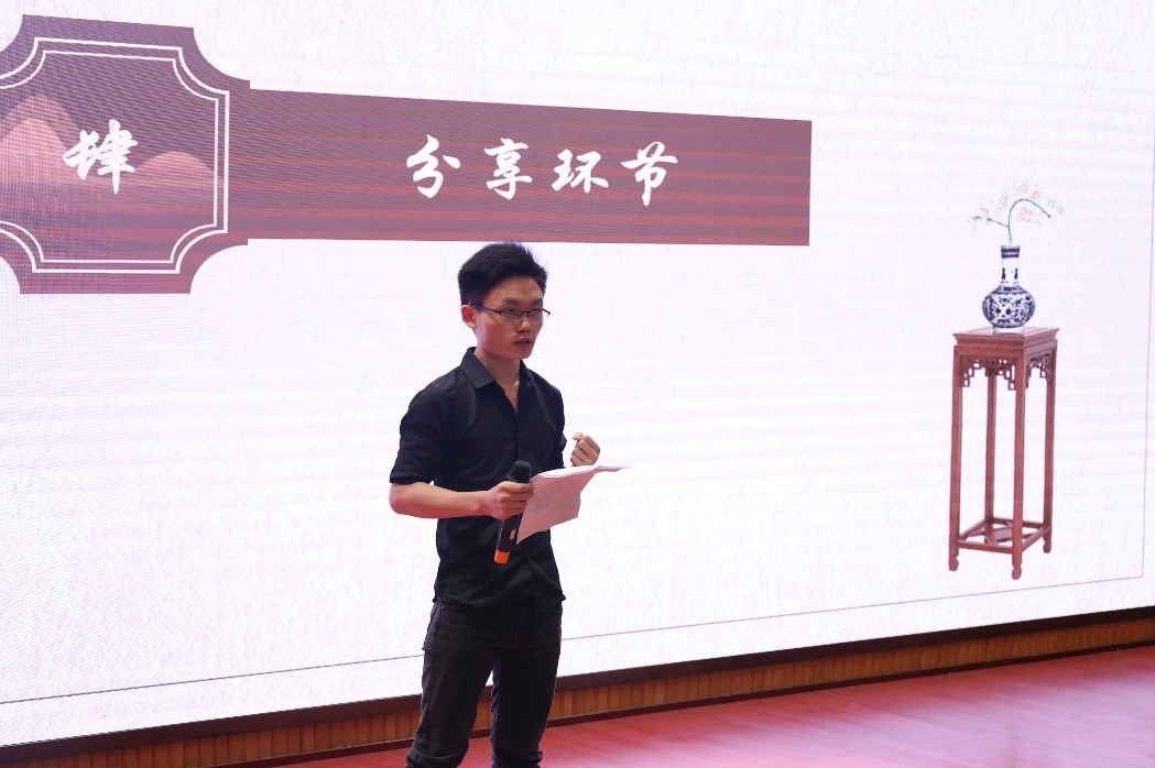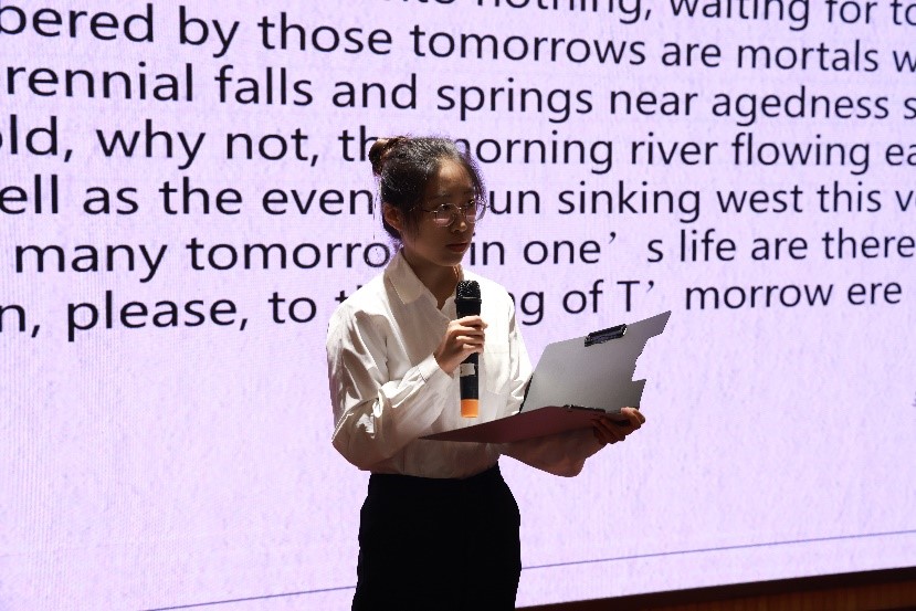 本次大赛选取了我校七十周年校庆的宣传标语、中国经典诗词作为翻译材料。译读大会选取了《明日歌》《临江仙·夜登小阁忆洛中回游》《劝学》《浣溪沙·游蕲水清泉寺》四首优秀译作现场诵读展示。“Behold, why not, the morning river flowing east its way.”道出了钱福对时间流逝的感慨;“After twenty dreamlike years I'm still there but feel on edge.”译出了陈与义对年华已逝的叹息。译者的字字句句,将古人的感思融入英语当中,精妙而震撼,给评委和观众留下了深刻的印象。点评环节奉霞老师从翻译作品的韵律和诗歌表意两个方面对选手的翻译水平作出高度评价,史凤晓老师认为选手们的翻译用词比较精准,句子处理比较精妙,努力保证了诗歌的对仗。老师们也建议选手们可以通过参考英文诗歌,通过更加缜密的思考让表达更加精确。
