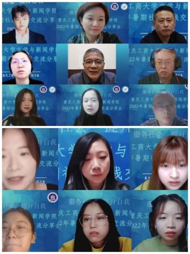 为深入学习宣传贯彻党的二十大精神,不断增长青年大学生知识和才干,培养有理想、敢担当、能吃苦、肯奋斗的新时代好青年,11月13日,文学与新闻学院通过线上方式举行2022年暑期社会实践交流分享会。我校党委常委、副校长陈运超,重庆租游科技有限公司总经理刘颖,头角文化传媒公司运营总监黄义航,文学与新闻学院学院党委书记于频、院长王仕勇、党委副书记程元元、副院长郑笑眉、广播电视学系主任王瑞林、广告学系主任王凌峰、分团委书记刘平出席本次会议。学院硕士生、本科生学生代表参与会议。