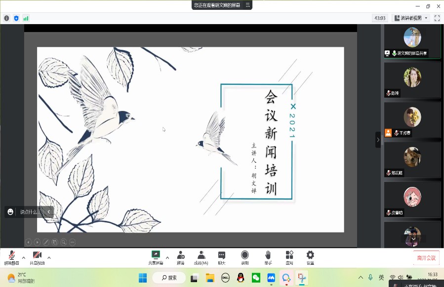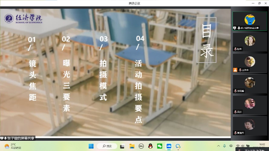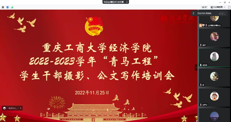 为推进学院学生工作有序开展,提升各部门学生干部摄影和公文写作能力,进一步加强学生干部队伍建设,11月25日下午,经济学院通过腾讯会议线上方式开展了“青马工程”培训之学生干部摄影、公文写作培训会。经济学院分团委学生会暨新媒体工作室、经济学院青年志愿者服务队、经济学院党员服务站和经济学院学生自主管理中心部门成员参与本次培训会。培训会由22级经贸类二班郑武峰同学主持,我校新闻中心采编部副部长胡文婵同学、经济学院分团委新媒体工作室负责人张子璇同学主讲。
