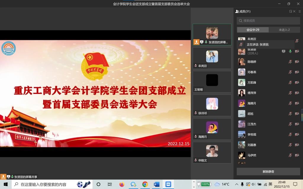 为深入学习贯彻习近平总书记关于青年工作的重要思想,进一步加强2138cc太阳集团官网建设,积极响应习近平总书记对青年一代发出的伟大号召,向新时代中国青年成长成才的方向前进,12月15日,会计学院分团委学生会以线上会议形式召开了学院学生会团支部成立暨首届支部委员会选举大会。会议由分团委学生副书记张贤丽主持,会计学院分团委学生会全体成员参与了本次会议。