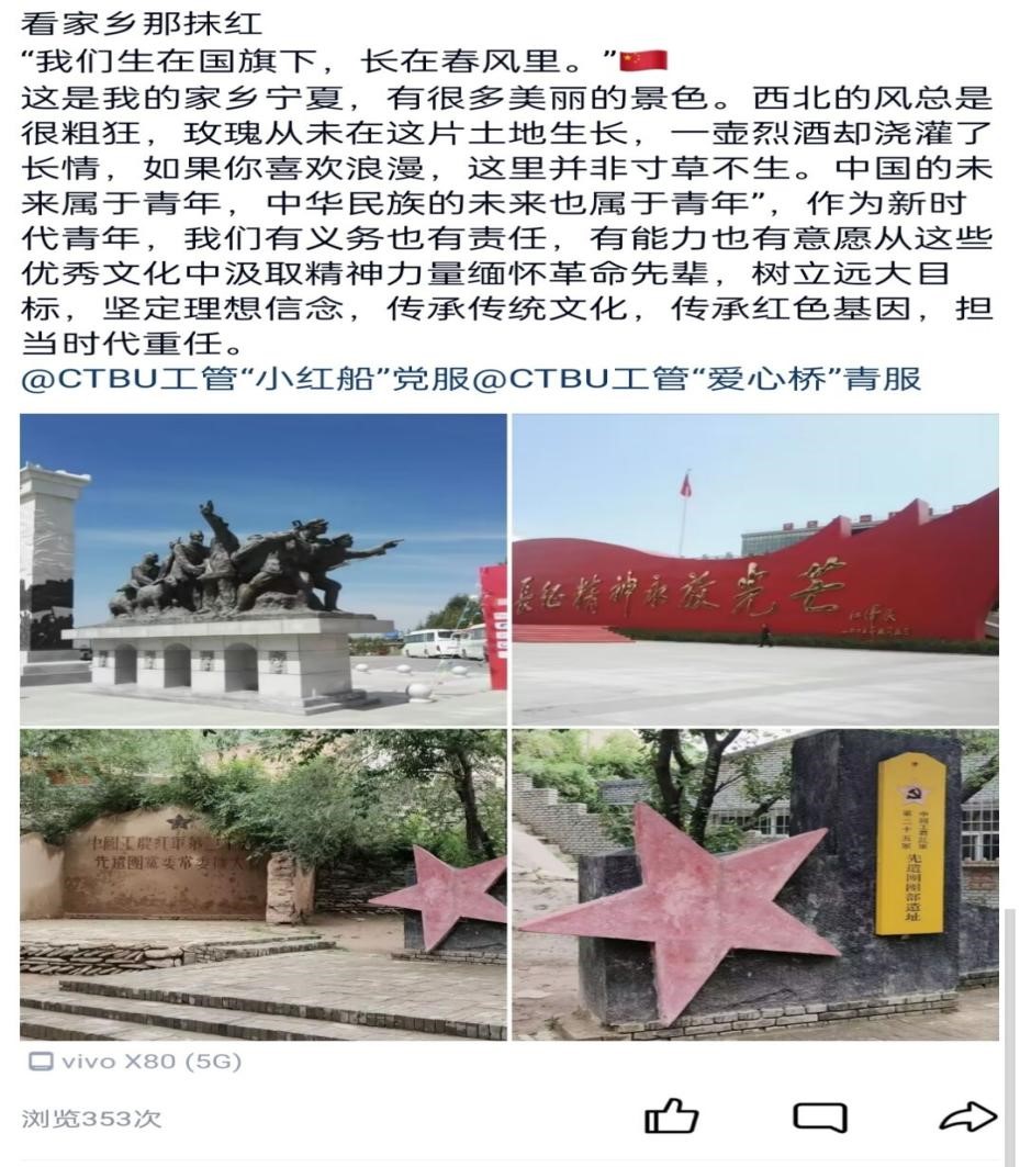 本次活动分为看家乡那抹红、忆家乡这十年、红色经典咏流传三个主题。参与者任选其一以组图、手抄报、手账或者唱歌等多种形式进行分享。活动受到同学们的热情参与,大家竞相投稿,有同学展示了家乡从一个破旧的小乡村到基础设施较完备的宜居乡镇的巨大变化,还有同学分享了在家乡了解到的红色故事。作品收集结束后,主办方根据作品截图点赞数进行排序,并进行最终公示。优秀参与者将获得精美奖品留作纪念。