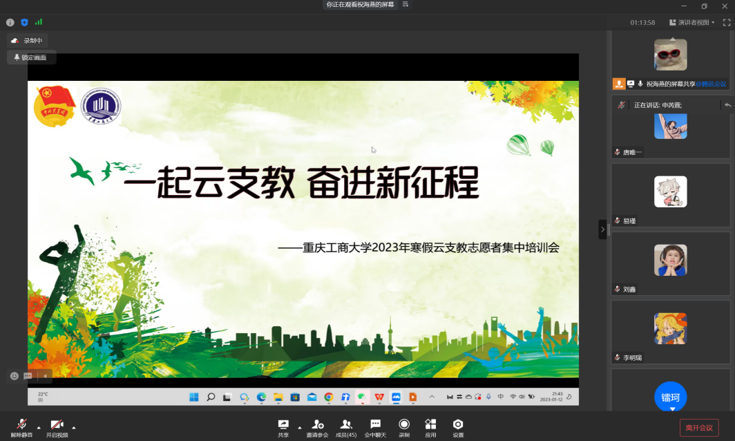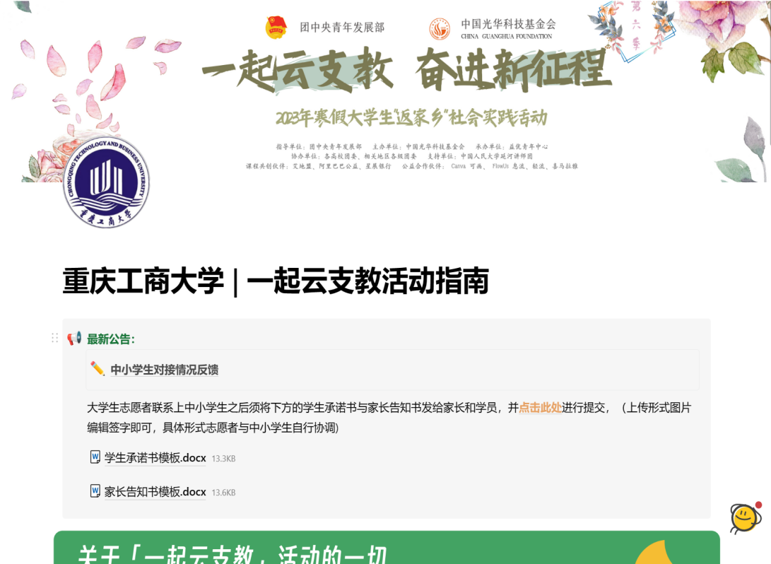 为深入学习宣传党的二十大精神,团中央青年发展部组织开展了全国大学生 2023 年寒假“返家乡”社会实践“学习二十大 奋进新征程”一起云支教专项活动,号召大学生在2023年寒假期间参与云支教社会实践和志愿服务活动,帮助中小学生丰富知识,扩宽视野,陪伴他们健康快乐地成长。去年暑假,国际商学院青年志愿者曾积极参与过“一起云支教,携手创未来”第五季活动,今年志愿者们再次积极响应团中央号召,秉持奉献、友爱、互助、进步的志愿服务精神,踊跃报名一起云支教第六季志愿服务活动,通过招募报名、线上面试等环节的考验,最终遴选出51名大学生志愿者组成“云支教”志愿者团队,通过线上方式为定点对接地的中小学生开展针对性教学,用青春与激情浇灌梦想,展现新时代青年的责任与担当。