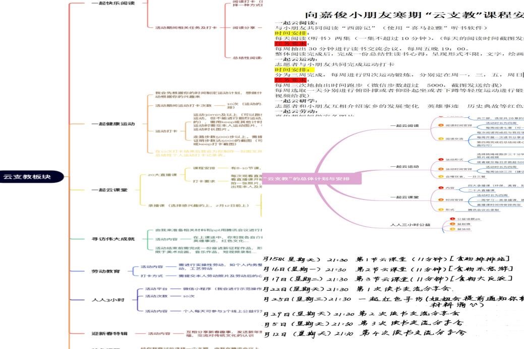 为奠定云支教工作基础,规范志愿者行为,提升志愿服务质量,支教执行团队在开展正式支教活动前做了充分准备。活动前期,执行团队首先制作了工作人员的工作计划,明确各自分工;同时,搭建了功能齐全的息流团队协作空间,为志愿者活动进度打卡以及数据检索查询提供巨大便利。为使志愿者团队更加明晰活动内容、活动任务,1月下旬,执行团队召开了寒假云支教全体志愿者集中培训会,“云支教”志愿服务团队全体志愿者、团队领队、执行专员、宣传专员以及指导老师共同参与会议。培训会上,云支教团队领队向全体参会人员介绍了活动前期准备阶段团队所进行的工作,并根据本项目志愿者手册从活动背景、活动内容、志愿者任务与要求等多方面进行详细讲解。同时,再次强调了活动的注意事项:第一,云支教的意义在于大学生志愿者与中小学生双方互学互助,相约云端共同成长;第二,要拥有责任意识,应认真完整地完成支教任务,授课前做好准备工作,向中小学生传授积极正能量的内容;第三,学会尊重少数民族风俗与文化,不能以个人的好恶去主观看待民族风俗习惯。培训会的最后,领队向志愿者回顾展示了暑期云之教活动的感动瞬间,并设置答疑环节,耐心地为志愿者答疑解惑。
