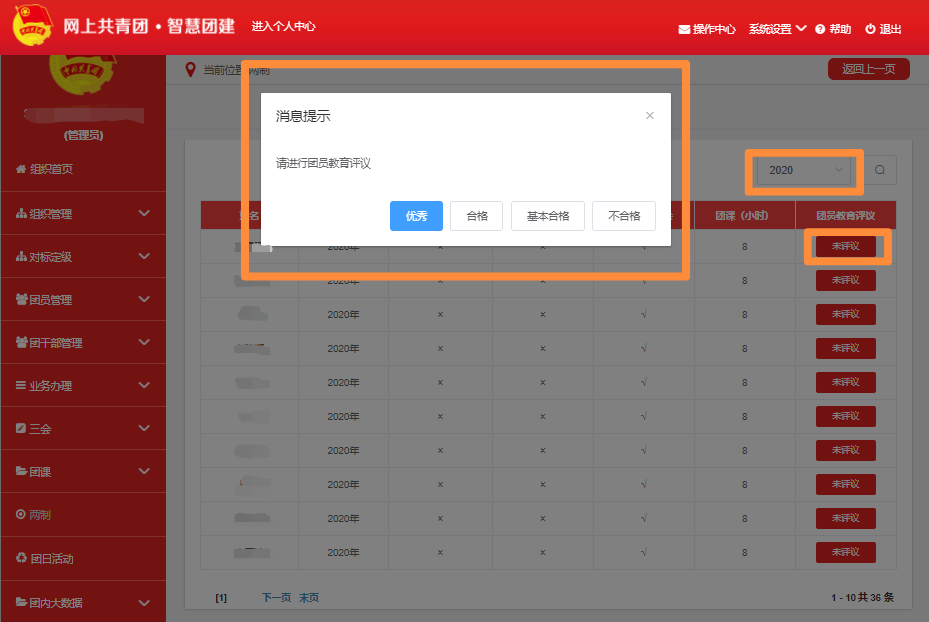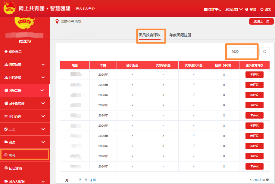 4.系统录入。以团支部为单位统一录入“智慧团建”系统。团支部书记登陆智慧团建系统,按照“两制-团员教育评议”流程进行操作。操作界面如下。