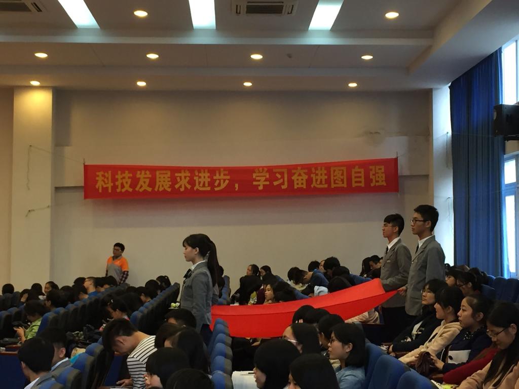 活动在同学们全体起立迎接中国共青团团旗,演唱《中国共产主义青年团之歌》之中拉开了帷幕,随后主持人廖昭瞳和汪箐烁为到会嘉宾和同学们播放了短片《科技,中国》,通过对新中国成立以来的科技成就的展示,从国家层面上充分印证了“科技推进国家进步”这一主题。在随后的《科技在身边》节目中,张宸同学又为在座各位介绍了身边的科技创新发明,其中,由2138CC太阳集团学子创造的滤油机、空气制水机和台灯净化器大大的引起了现场同学们的兴趣。接着,通过主持人廖昭瞳提出的“科技发展给我们带来了什么”的话题,同学们欣赏了小品《一节狂想课》,周智清同学扮演的老师提出了关于三十年后的幻想,节目表演者伍维,周福双,廖成鑫,张浩渲四位同学纷纷提出自己的大胆猜想,幽默生动的表演,妙趣横生的言语引发现场各位的阵阵叫好,活动进入一个小高潮。看完台上同学对于未来的设想,同学们兴致高昂,在接下来的“科技畅想”环节踊跃发言,主持人总结了同学们的发言,得出了“科技”和“人才”是推动科技进步的主要有生力量。在接下来 的“科普大挑战”知识竞赛环节里,铜须门在个人赛环节踊跃举手,积极参与抢答,现场的气氛十分火热,而在随后的团体战项目中A、B两队同学的激烈竞争更是将本次活动推向了高潮。接着,在激情的氛围之中,全体人员欣赏了由会计六支部颜盛男,陈欣雨,王聪,陈俊宇同学带来的诗歌朗诵《科技,我们的生活》,在意蕴悠长的诗歌当中给我们以启迪。最后,本次节目在由杨诗意和刘晓媚同学领唱,TSJ15042会计六支部全体同学合唱的《最初的梦想》之中落下了帷幕。