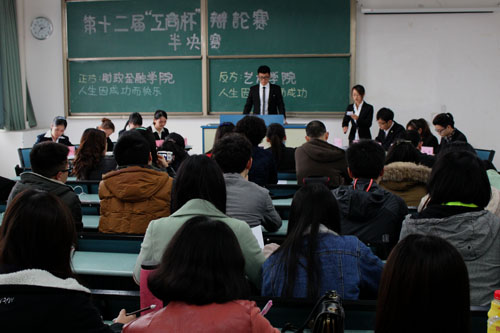 我校研工部部长王小玲,学术期刊社社长王仕勇,评估办主任宋豫,保卫处副处长邹奇,文学与新闻学院党总支书记段庸生、副院长康清莲,通识学院党总支副书记谢瑞军,经管中心主任周莉及校团委副书记杨娟等应邀出席并担任大赛评委。经过双方一辩极具概括性的陈述为辩论开篇立论。紧接着,正反方辩手围绕“成功对于个人的意义及对于社会的意义”、“成功与快乐的相互关系”等论点引经据典,侃侃而谈,运用各种社会热点事件和焦点人物的事迹强化各自论点。