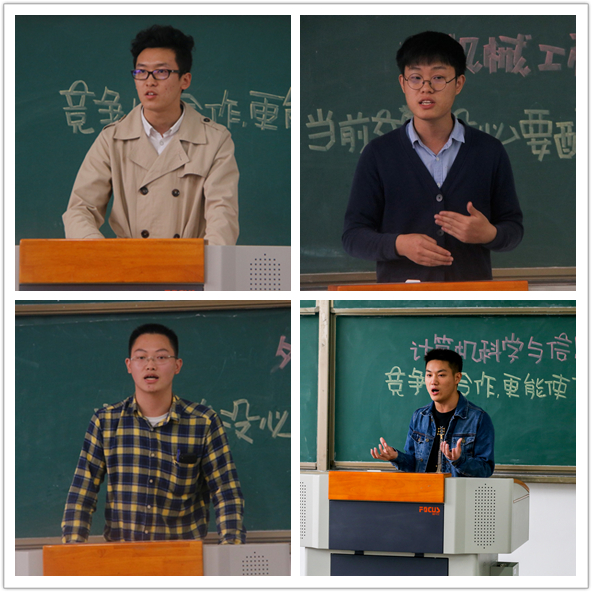 在观众的翘首盼望下,上半场比赛拉开帷幕。法学院和管理学院、现代国际设计艺术学院和计算机科学与信息工程学院、数学与统计学院和艺术学院就“合作是否比竞争更能使文明进步”展开了激烈地论述。双方辩手在各个回合里“斗”志昂扬,据理力争,力求在有限的时间中更胜一筹。无论是谈“历史发展离不开合作”,还是对“合作是促进社会由量变到质变的关键因素”等方面的考虑,来自现代国际设计艺术学院的辩手观点明确而富有逻辑。在自由辩论环节,计算机科学与信息工程学院的辩手凭借其悉心准备的防点坚定己方立场,认为正方辩手对马克思主义理解不够深刻,气势如虹,势如破竹。双方你来我往,你破我立,气氛几度紧张而又精彩纷呈。