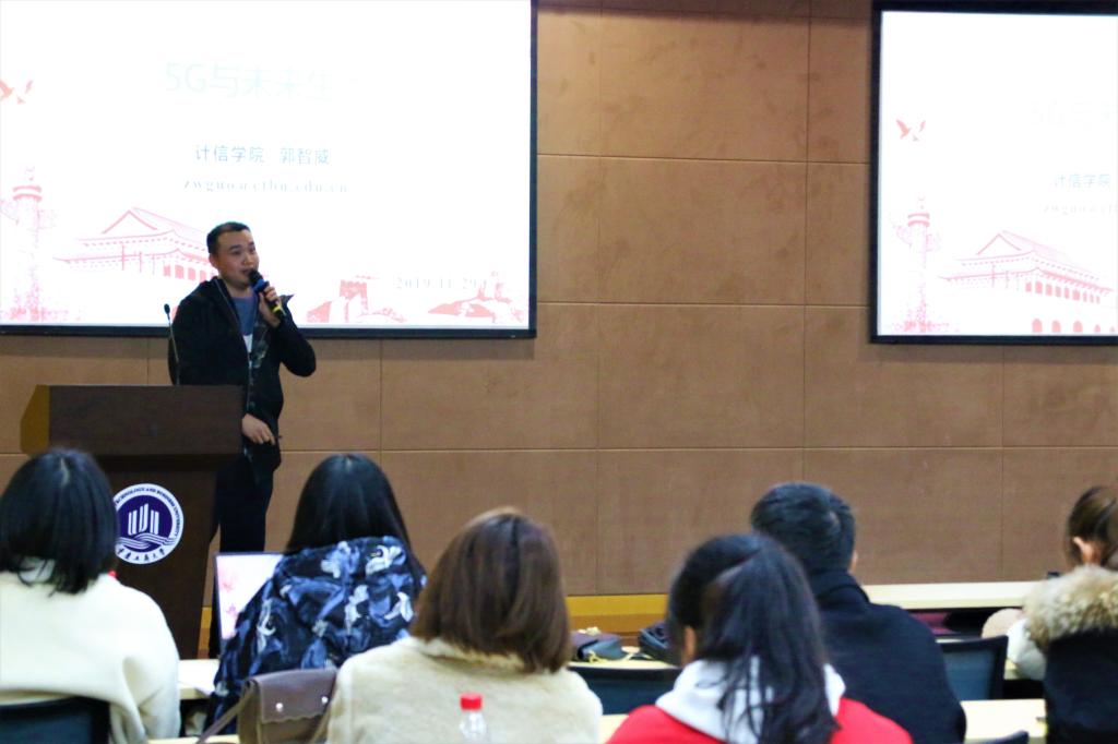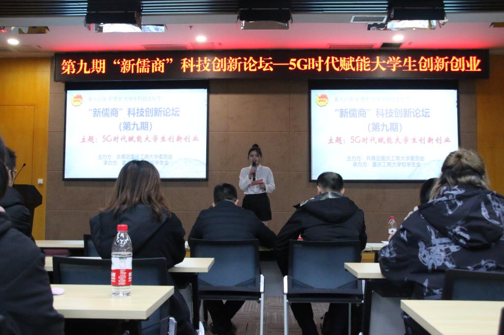 近年来,第五代移动通信系统5G已经成为通信业和学术界探讨的热点,为加强我校学生对5G时代的理解,为创新创业提供更好的基础,实现科教兴国。11月29日15:00,由校团委主办的第九期“新儒商”科技创新论坛在南岸校区图书馆二楼多功能厅举行。本次论坛以“5G时代赋能大学生创新创业”为主题,校团委书记杨娟,商务策划学院龙跃教授,计算机科学与信息工程学院郭智威博士,何林欣同学和100多名各学院的学生代表参加活动。