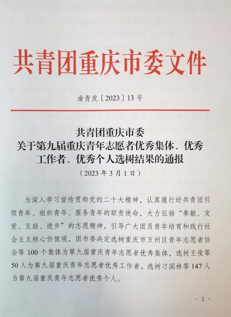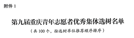 为深入学习宣传贯彻党的二十大精神,认真履行好共青团引领青年、组织青年、服务青年的职责使命,大力弘扬“奉献、友爱、互助、进步”的志愿精神,引导广大团员青年培育和践行社会主义核心价值观,团市委决定选树 100 个集体为第九届重庆青年志愿者优秀集体,选树50人为第九届重庆青年志愿者优秀工作者,选树147人为第九届重庆青年志愿者优秀个人。
