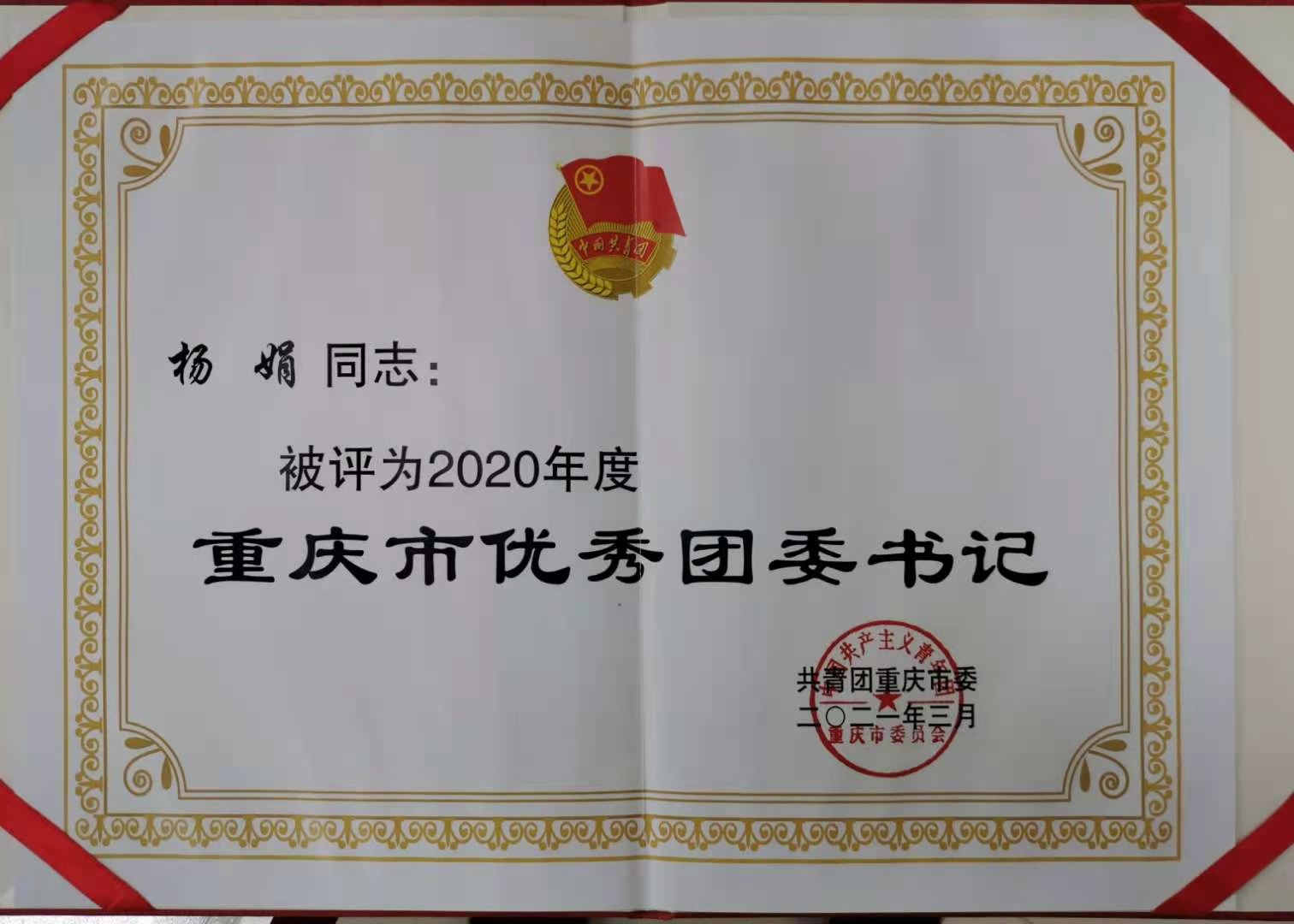 近日,共青团重庆市委下发了《关于2020年度共青团工作目标考核结果的通报》(渝青发〔2021〕8号),我校在2020年度重庆市共青团工作目标考核中荣获特等奖。杨娟同志被评为“2020年度重庆市优秀团委书记”。